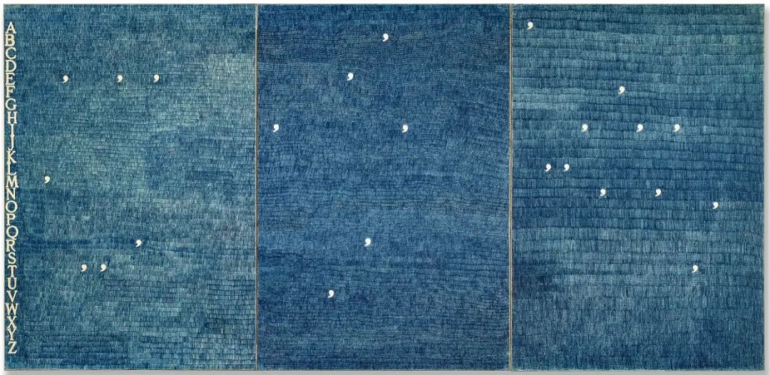 非洲艺术家艾尔·亚纳苏的《斑马方格》以其极为精巧的装饰工艺引人注目,银色、蓝色、黄色与红色反光带交织成细密的画面结构。该作属于艾尔·亚纳苏艺术生涯中最具代表性、最负盛名的系列之一。这种视觉语言既深植于艺术家的加纳文化背景与历史记忆中,同时又呈现出一种超越地域的当代气质。