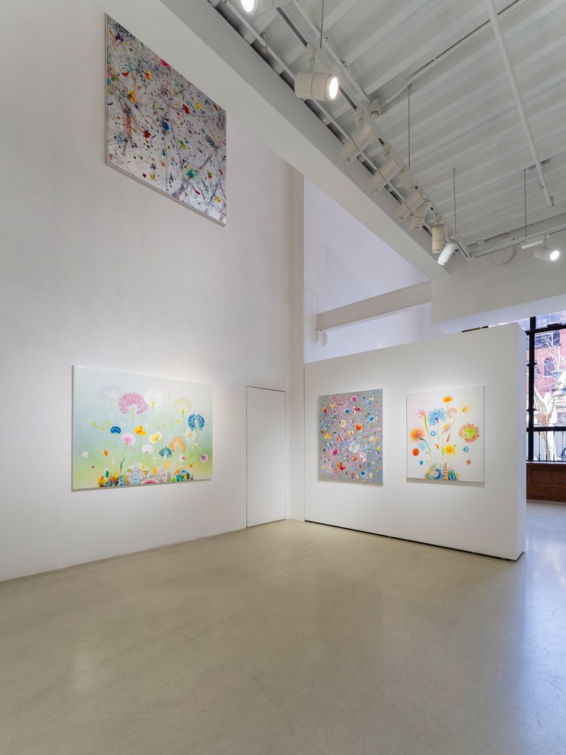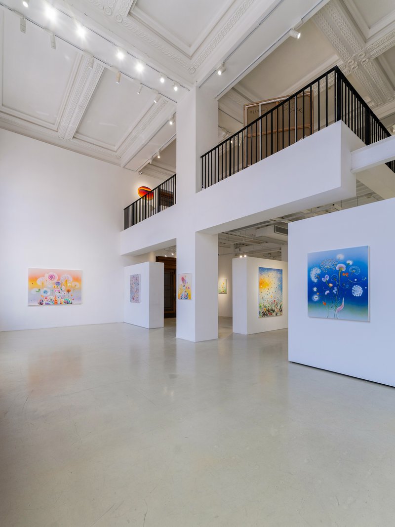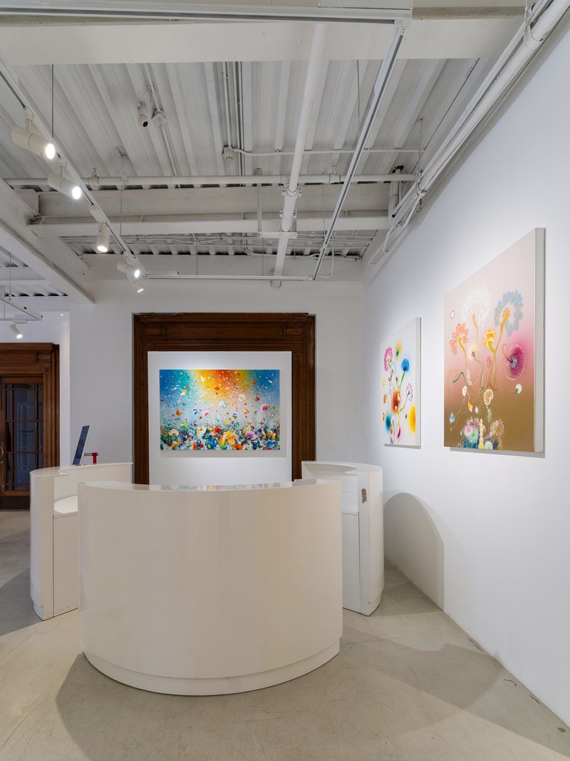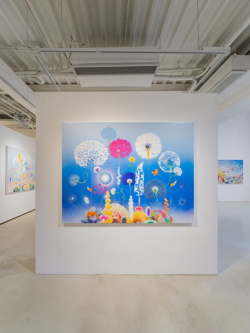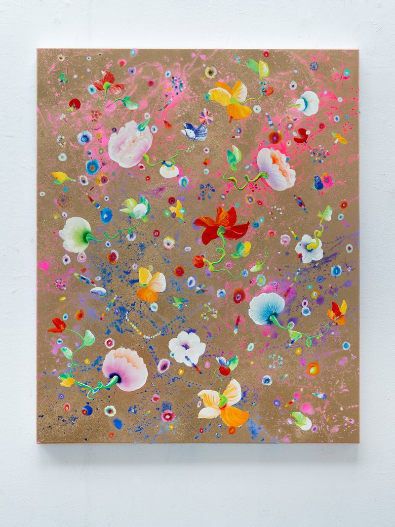 菲兹的艺术理念,是对十九世纪浪漫主义精神的当代回应与转化。不同于传统浪漫主义大师以险峻的高山大海反衬人类的渺小,菲兹透过微观与宏观的模糊重塑了当代的崇高感。画布上的有机体既似显微镜下的细胞分裂,又如望远镜里的星系爆炸,这种科学与诗意的结合,揭示了生命起源的神秘力量。他笔下的花朵与藤蔓并非植物学的写实纪录,而是情绪的载体,构成了一幅幅内在风景。那些高饱和度的色彩,并非自然界的物理色泽,而是经过记忆与情感滤镜处理后的心理显影。这种对时间的凝视在展览「风起时」中达到极致:风虽无形,但当它吹散花瓣的那一秒,正是生命力最旺盛也最脆弱的时刻。