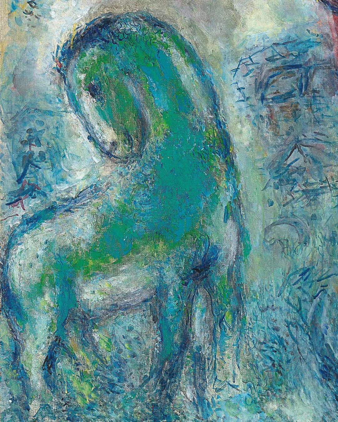 而画中之马就如同他笔下反复出现的公鸡与其他动物,与其说是真实的生物,不如说是由记忆与梦境交织而成的“情感信使”。在夏加尔的艺术世界中,马是一种带有神秘灵性的存在。它常以轻盈雀跃的姿态出现,而静立时谦卑的姿态与低垂的眼眸蕴含虔敬光芒。它不仅可以是马戏团中的表演者,更引领艺术家超越现实,通往更纯净、更自由的生命境界。