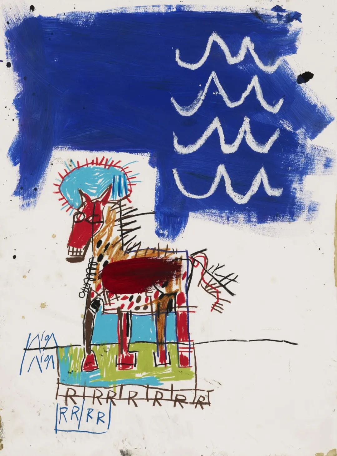 创作《无题》(Untitled)时的巴斯奇亚,年仅21岁。作品以艺术家早期标志性的疾驰线条与炽烈节奏绘就。画中一匹孤马立于蓝天之下,马蹄下方的地面可见一串字母“RRR”,这组辅音如同视觉上的震响:蹄声震地、疾驱时的翻涌气息。马的力量、速度与张力被“RRR”这组声响般的符号点燃,牵引观者亲身感受它的澎湃生命力。