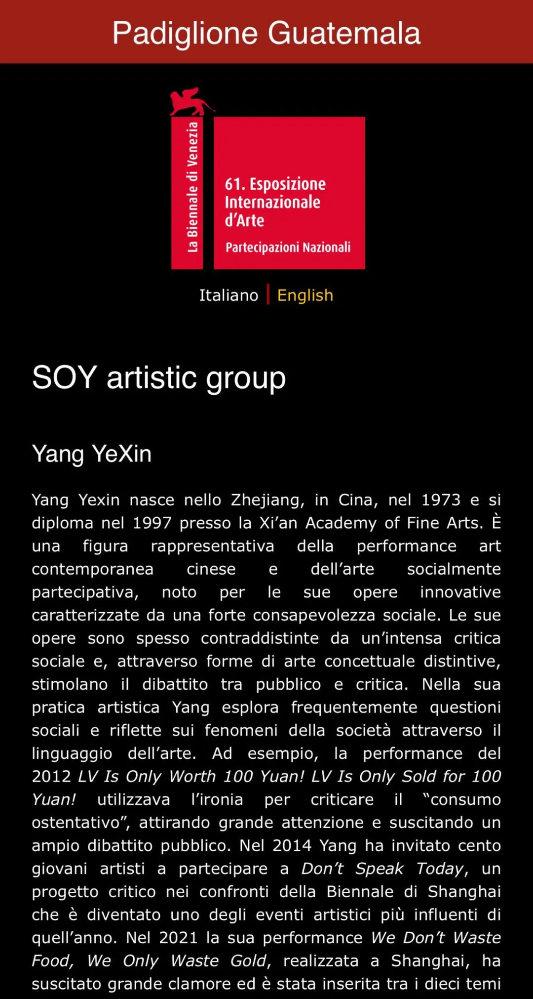 我们欣然宣布,艺术家杨烨炘已获准加入由文化与体育部部长莉维·德尔·卡门·伊马科拉塔·格拉齐奥索·谢拉指导,并由斯特凡妮娅·皮耶拉利切与艾尔西·温德里希策展的危地马拉国家馆"SOY"艺术团体。经评审其作品集,该艺术家的作品创作概念与上述主题中所提及的危地马拉馆展览策展理念非常契合。