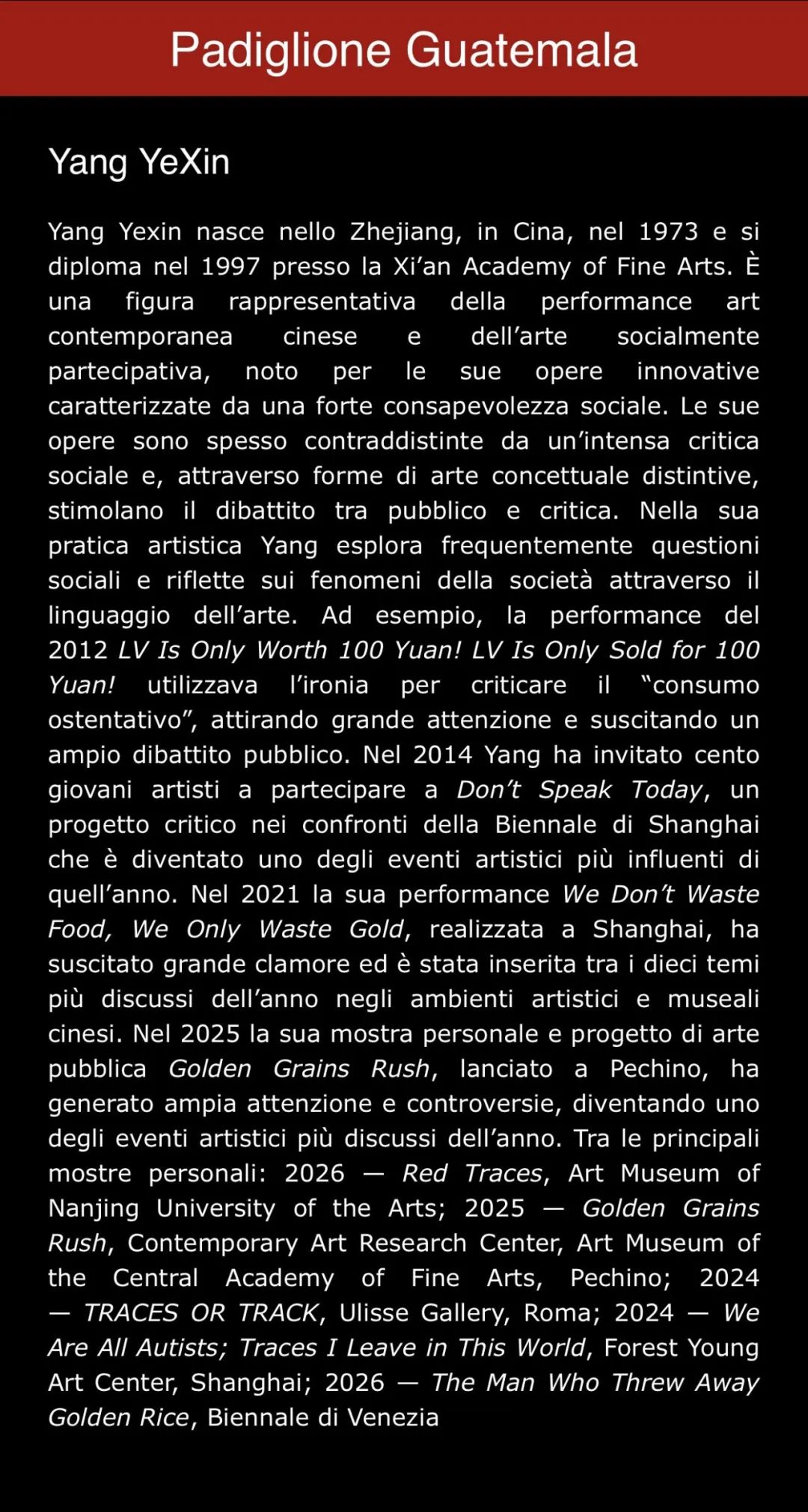 重要个展:2026年的南京艺术学院美术馆个展《红色痕迹》,2025年的北京中央美院美术馆当代艺术研究中心《Golden Grains Rush》,2024年的罗马Ulisse gallery《TRACES OR TRACK》,2024年的上海Forest Young艺术中心《我们都是自闭症患者》和《我留在这个世界上的痕迹》。