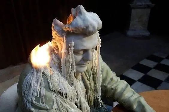 这是瑞士艺术家伍斯·费舍尔(Urs Fischer)最为人熟知“蜡烛雕塑”系列。在这个系列中,他创作了与真人等大的蜡像人物,并在蜡像的头部或身体其他部位插入一根或多根蜡烛芯。当蜡烛被点燃后,蜡像会随着展览的进程逐渐熔化、变形、坍塌,直至最终化为无形。